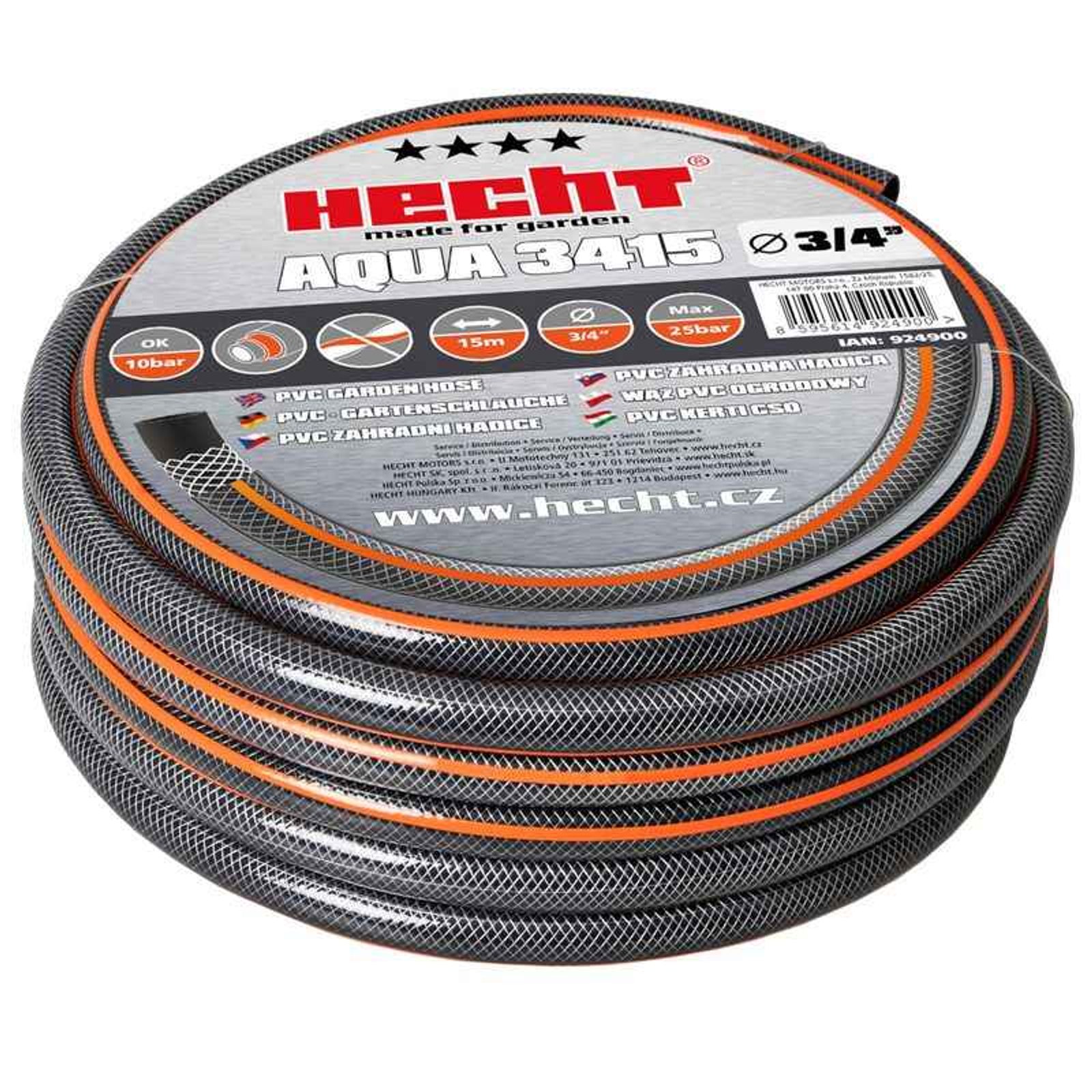 A HECHT AQUA egy tartós, háromrétegű PVC tömlő, amely lágyított PVC és műszálas nyomófonat kombinációjából készült. A belső fekete réteg megakadályozza az algaképződést és UV-védelmet biztosít. A műszálas középső réteg nagy nyomásállóságot biztosít a tömlőnek. A sima külső réteg nagy kopásállóságot biztosít, így a tömlő jobban siklik a talajon. A tömlő nagymértékben formatartó. A maximális nyomás legfeljebb 25 bar, a normál üzemi nyomás 10 bar. A tömlő átmérője 3/4". A tömlő hossza 15 m.
