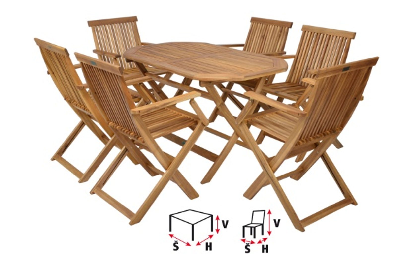 Kemény akácia fából készült, luxus kivitelben, hat székből és egy asztalból álló kerti bútor szett. Használható kerti fedett helyeken és beltérben. Megfelelő teakfa olaj kezeléssel külső helyeken is használható. A fa természetes anyag.