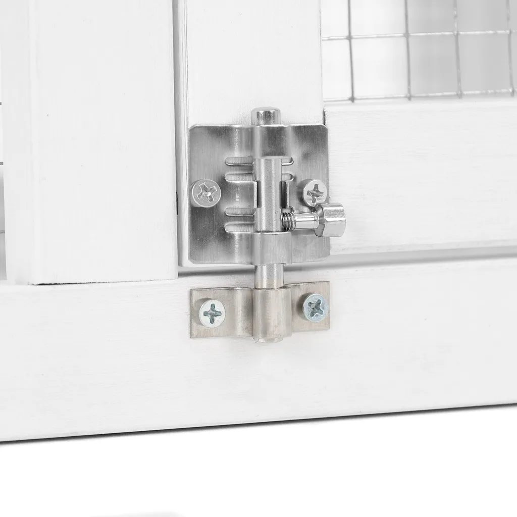A nyúlketrec tartozéka horganyzott fiók a könnyebb tisztításért, bitumenes tető,1 önálló ajtó az 1. emeleten, 2 hálós ajtó a földszinten, lezárható átjáró a szintek között.