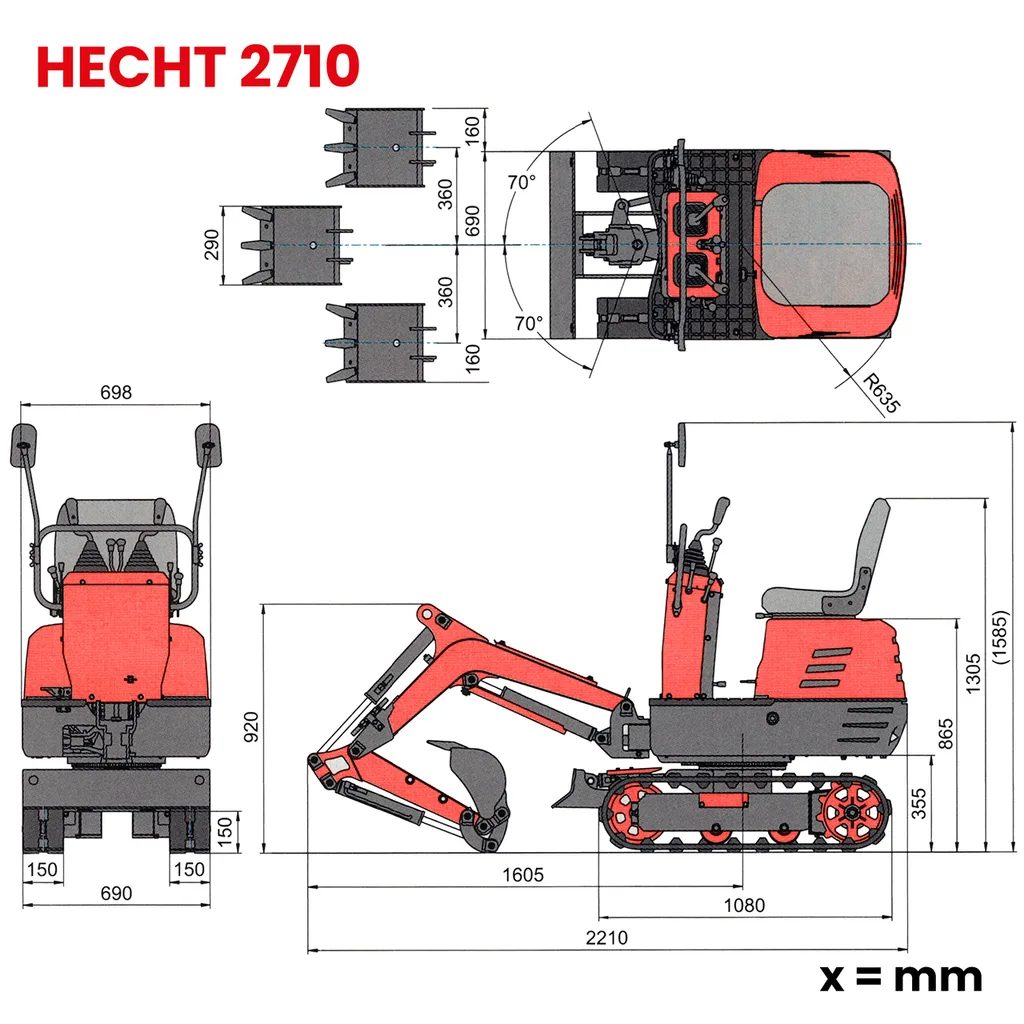 A HECHT 2710 minikotró egy négyütemű, 306 cm³ lökettérfogatú, 6,3 kW (3600 ford/perc) teljesítményű és 18,5 Nm nyomatékú OHV motorral, 6 literes üzemanyagtartállyal és 1,1 literes olajtartállyal van felszerelve. 0,011 m³ kanáltérfogattal (szélesség 29 cm), 8,8 kN (kanál) / 4,2 kN (kar) ásóerővel, 6,2 kN vonóerővel, 1,7 km/h sebességgel, 150 mm-es nyomtávval és 15°-os maximális munkadőléssel rendelkezik.