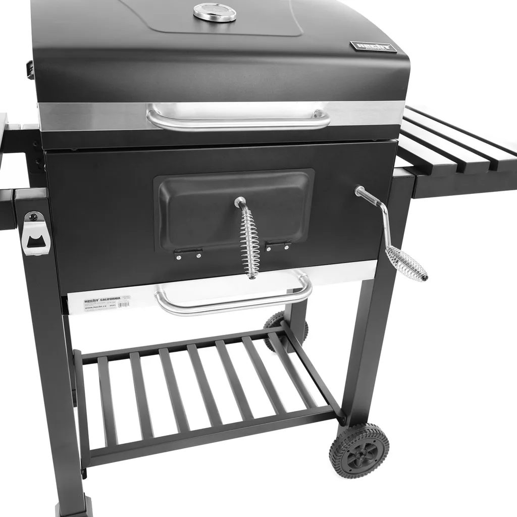 A HECHT CALIFORNIA egy kiváló minőségű faszén kerti grill, melyre jellemző a tömör horganyzott acél konstrukció, hőálló fekete festékkel. Tágas, 61,5 × 46 cm-es rozsdamentes acél grillrácsa van, amellyel egyszerre nagyobb mennyiségű ételt készíthet. A grill oldalsó polcokkal van felszerelve a grillező eszközök és hozzávalók kényelmes kezeléséhez. A két keréknek köszönhetően könnyen mozgatható. Ideális családi grillezéshez a kertben vagy a teraszon.
