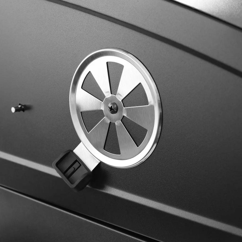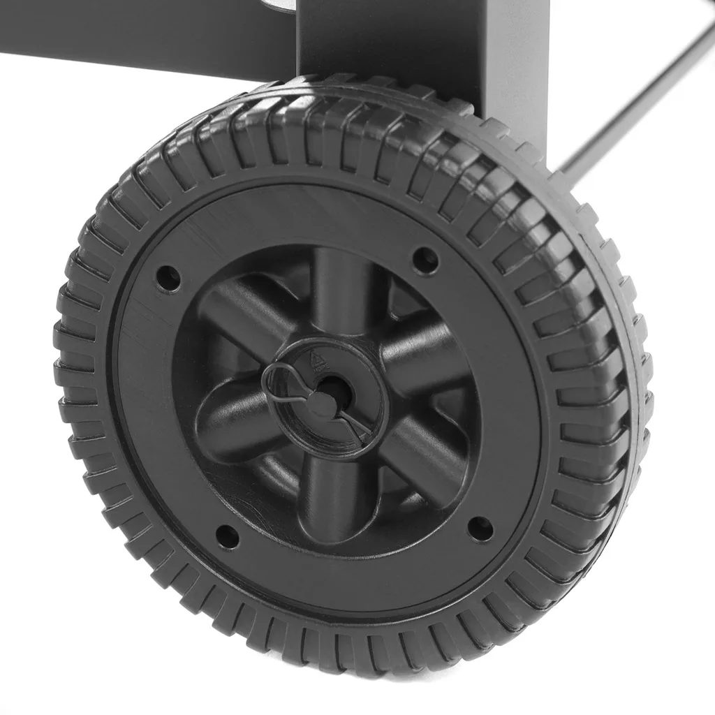Egyéb jellemzők: Hőálló fekete szín, rozsdamentes acél grillrács, oldalsó fapolcok, kerekek a könnyű kezelhetőség érdekében